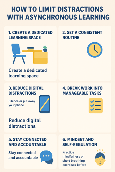 Asynchronous learning—when students complete work independently, can sometimes lead to irritability or difficulty concentrating. Establish consistent routines for this time, incorporate mindfulness practices like breathing exercises or yoga breaks, and set clear goals for each session. Using an alarm or timer can help manage work periods and break times effectively.